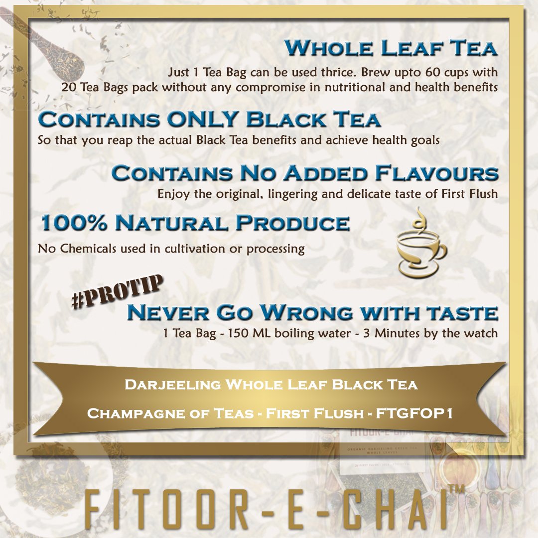 Packet contents: 20 Tea Bags filled with Clonal Black Tea Whole Leaves, hand curated with finest natural ingredients and carefully selected from finest tea estates by tea connoisseurs.