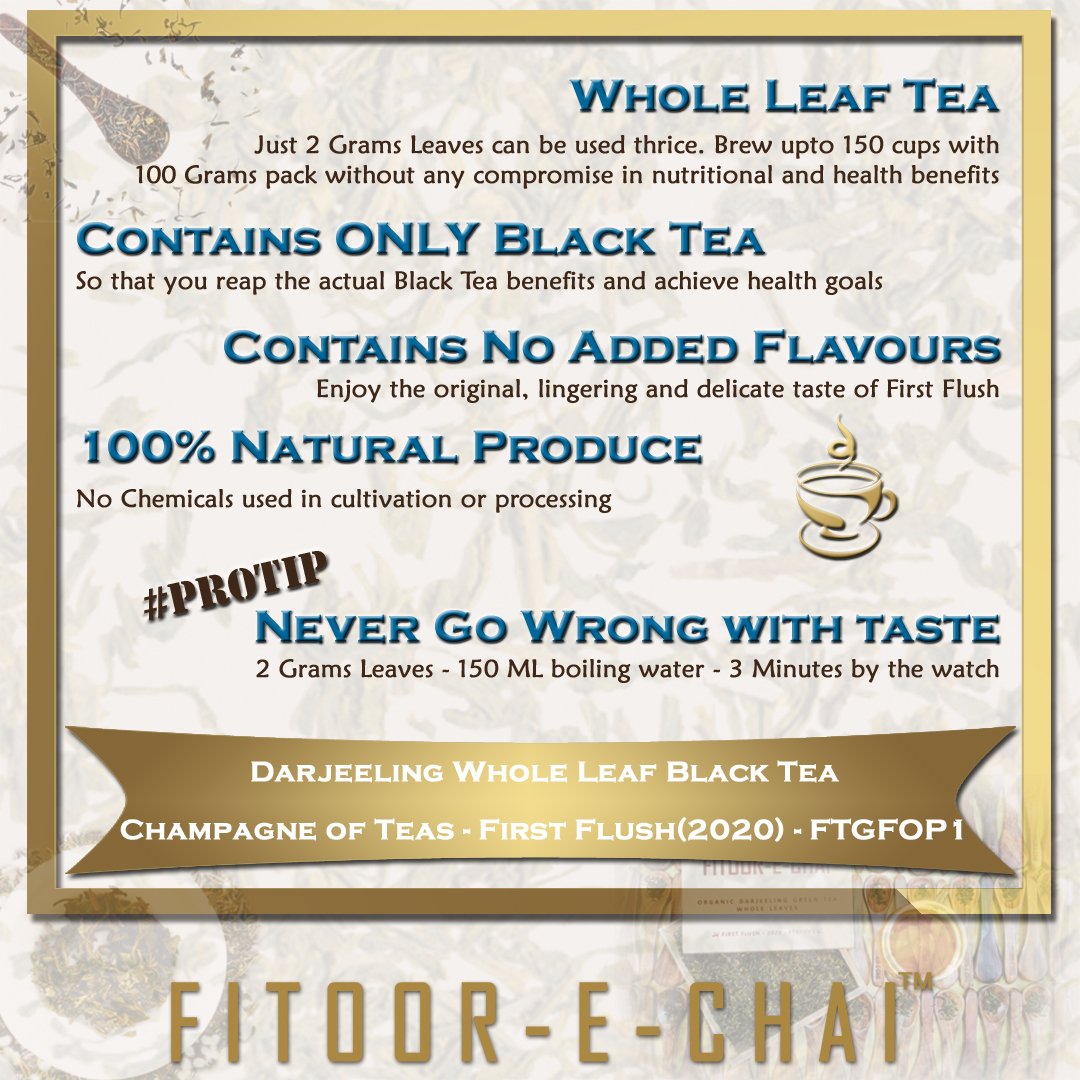 The FIRST FLUSH consists of the first few leaves grown after the plant’s winter dormancy and produce a light floral tea with a slight astringency. Being a First Flush, this tea requires specific temperature and steep time as detailed in the steeping instructions given inside the pack.